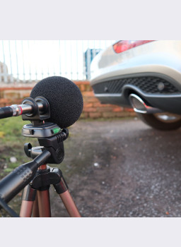 Vehicle noise measurements are generally carried out in line with the ISO 5130 standard and other similar measurement standards. In this case the microphone should be positioned 0.5m from the exhaust outlet at an angle of 45°. The engine is brought up to the speed specified by the standard (it varies a little for different vehicles) and a measurement is made. This is repeated three times and the sound level meter calculates the LArep as required.